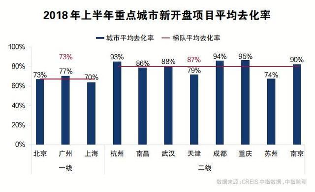 “去化率”是指銷售量與供應量的比率,是衡量房地產銷售狀況的一個重要指數。2018年上半年,全國14個重點監測城市新開住宅項目當天去化率均值為89%。重慶、成都、杭州、南京4個城市去化率超過平均水平。近九成的去化率,證明目前房屋仍需求緊俏。