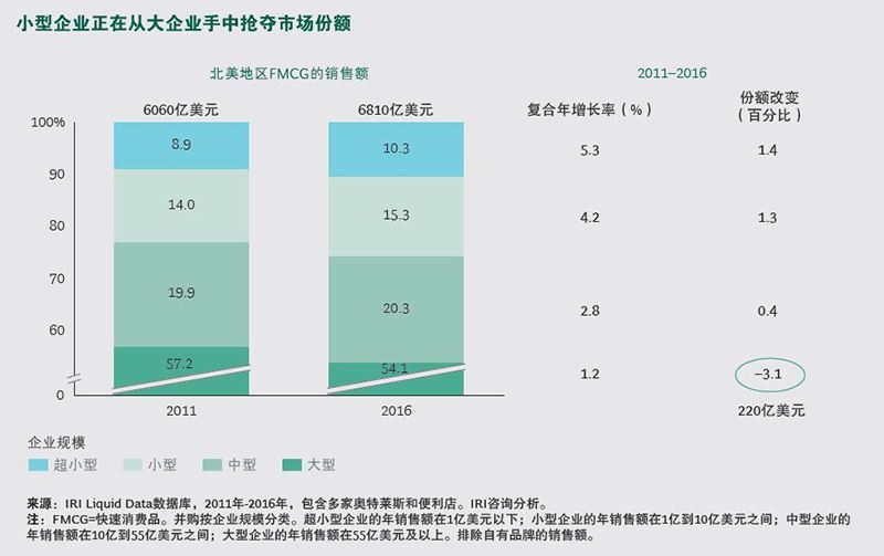 過去50年,跨國消費品企業(yè)強化品牌、擴展產(chǎn)品組合、穩(wěn)步提高市場占有率和收入,創(chuàng)造了強大的股東價值。那曾是大媒體、大零售商、大品牌的時代。大約五年前,規(guī)模較小的企業(yè)和品牌首次開始瓜分大品牌的蛋糕。在2011年到2016年間,北美地區(qū)大約220億美元的行業(yè)銷售從大企業(yè)轉(zhuǎn)移到小企業(yè)。歐洲也經(jīng)歷了同樣的改變。